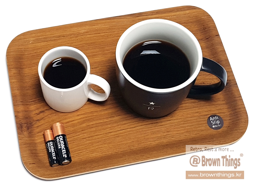 킨토 논슬립 티크나무 원목 쟁반 S에 투썸플레이스 미니 머그(90ml), 스타벅스 리저브 머그(TALL 355ml 용량)를 올린 모습.