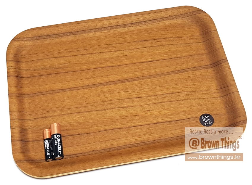 킨토 논슬립 티크나무 쟁반 M의 크기 비교를 위해 AAA / AA 규격 건전지를 놓고 촬영.