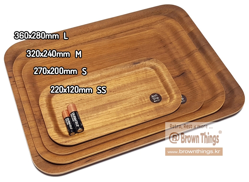 킨토 논슬립 티크나무 쟁반 L의 크기(360x280mm)의 크기 가늠을 위해 듀라셀 AAA / AA 규격 건전지를 놓고 촬영.