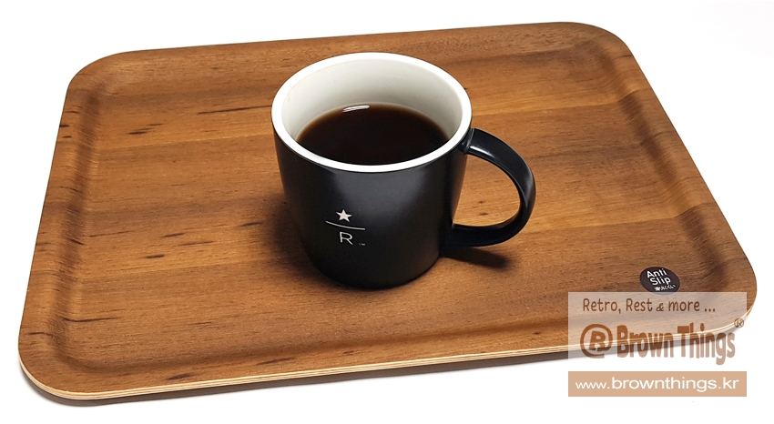킨토(KINTO) 논슬립 티크나무 쟁반 L 위에 올려 놓은 스타벅스 리저브 TALL(355ml) 머그컵.