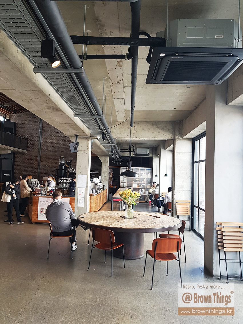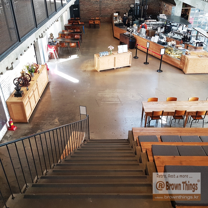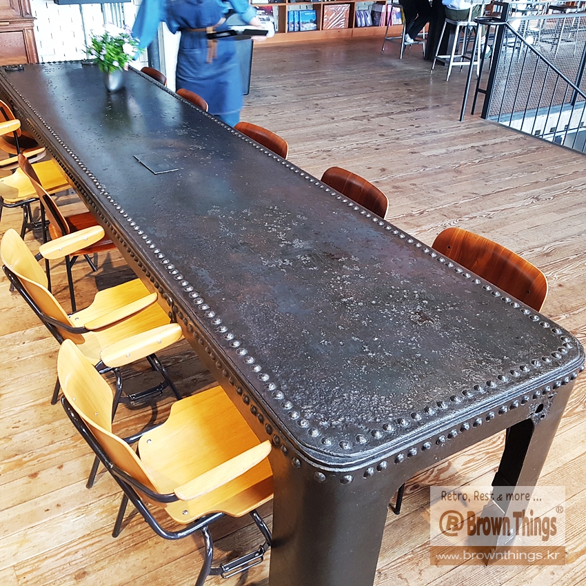 테라로사 서종점 2층 계단 앞의 12인석 무쇠 탁자.