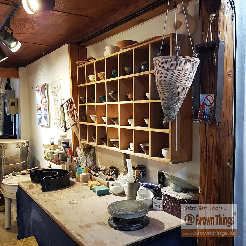 흙 반죽해서 물레로 빚고 가마에 구워서 완성품 도자기 커피잔을 만들어내는 글자 그대로 공방(工房).