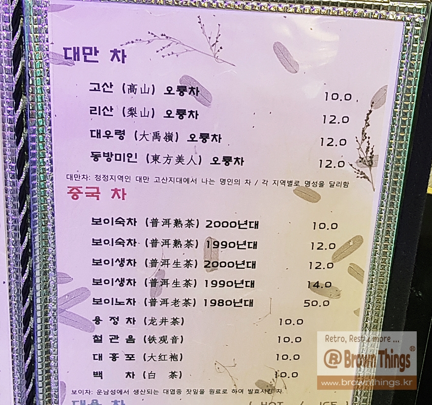 잎차 중심 찻집답게 청차, 보이차, 녹차로 세분한 메뉴.