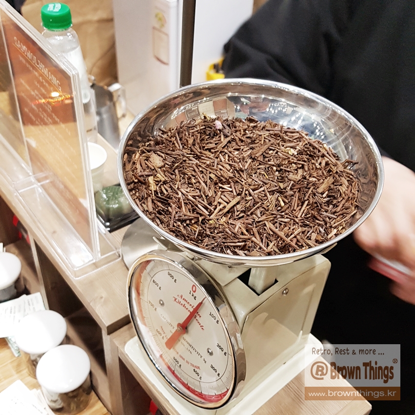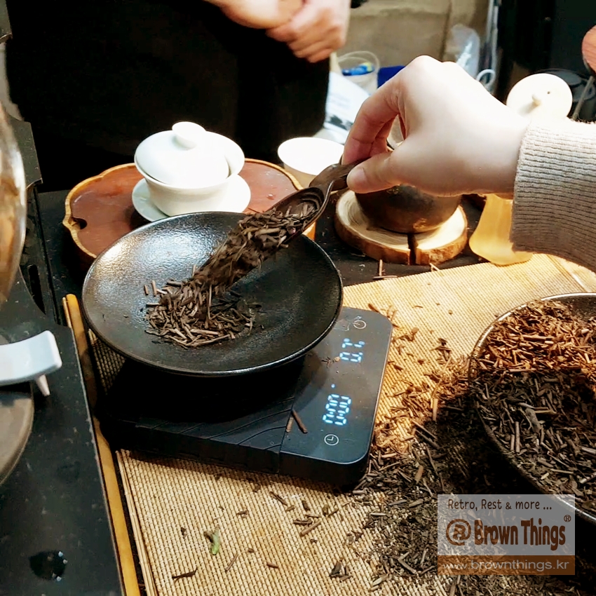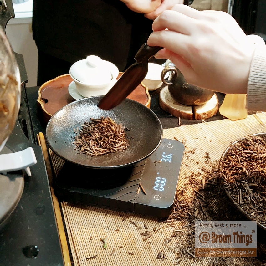 보이는 것보다 가벼운 호지차 찻잎을 차칙으로 3g을 가늠해 떠서 저울에 무게 측정.