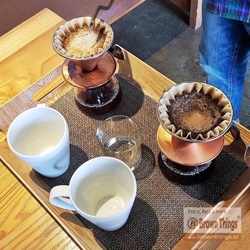 바리스타가 드립 도구를 앉은 자리에 가져와서 탁자 위에 놓고 보는 앞에서 추출해서 제공.