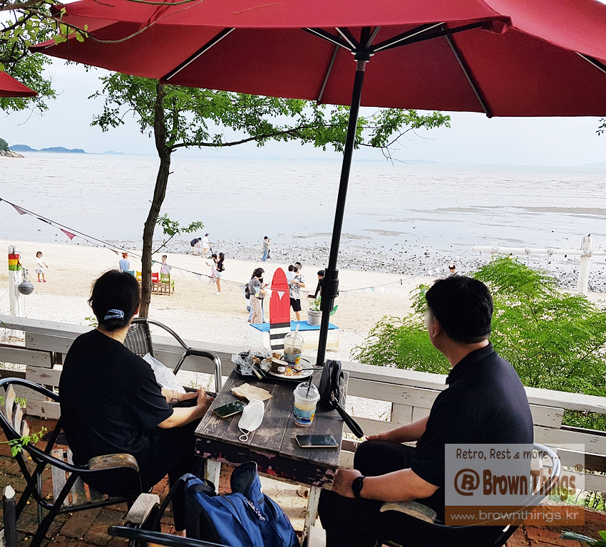 안산시 소속 대부도와 인천시 소속 영흥도 사이의 작은 섬 선재도에서 가장 저명하고 유명한, 당너머해변을 앞에 둔 카페.