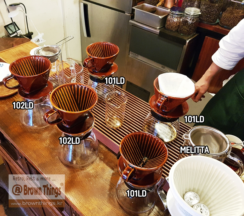 망원동 커피하우스 마이샤에서 주력으로 사용하는 칼리타 101LD, 102LD 갈색 도자기 드리퍼.