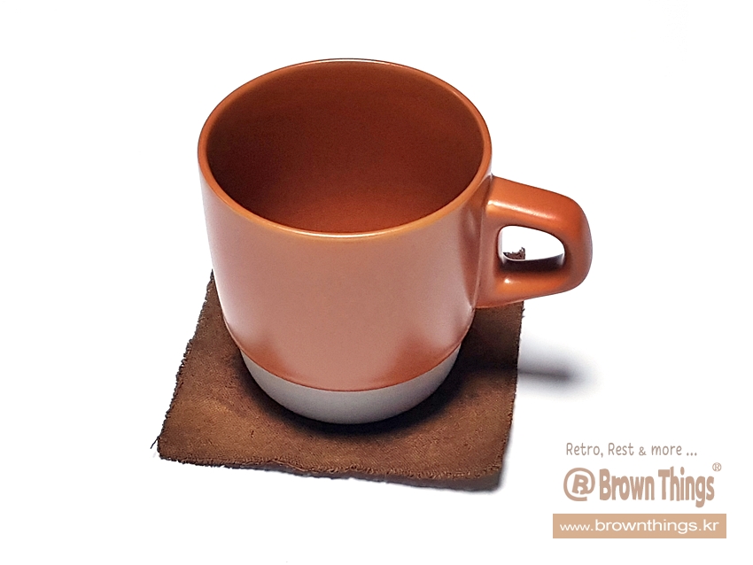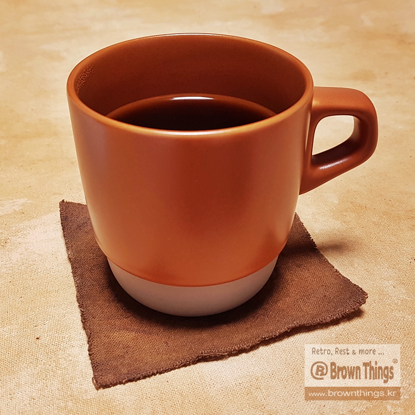브라운 띵스 부설 [[감물 연구소]]에서 만든 [감물 염색 커피잔받침 _ 스무하루] 위에 놓은 킨토 슬로우 커피 스타일 도토리 머그컵.